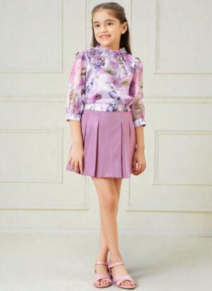 Girls Lavender Floral Top and Purple Pleated Skirt Set