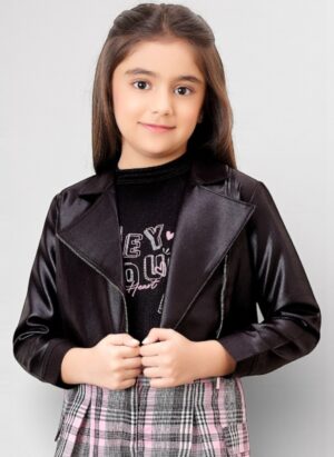 Girls Edgy Black Leather-Look Jacket and Plaid Skirt Set