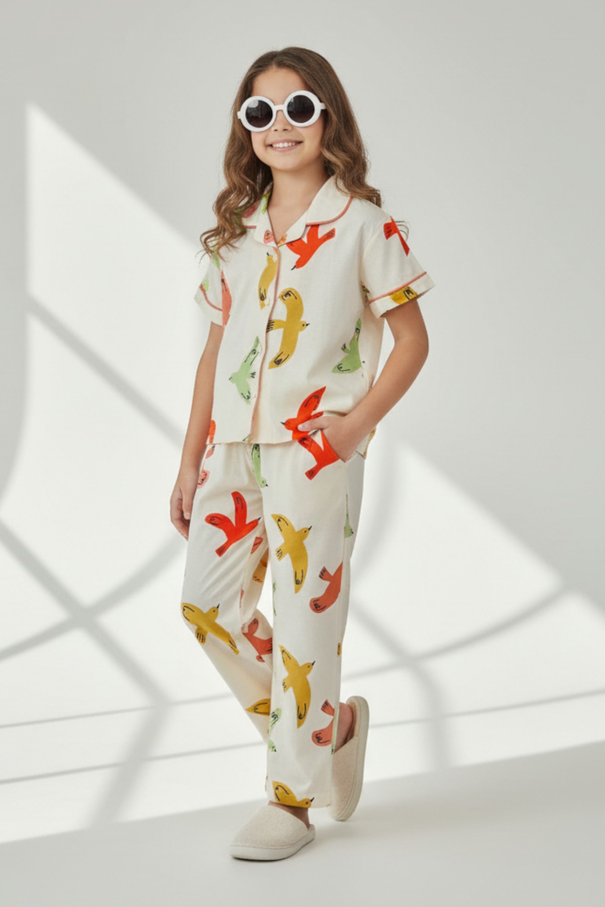 Cheerful two-piece cream nightwear set featuring a colorful flying bird print with a button-down top and matching ankle length pajamas.