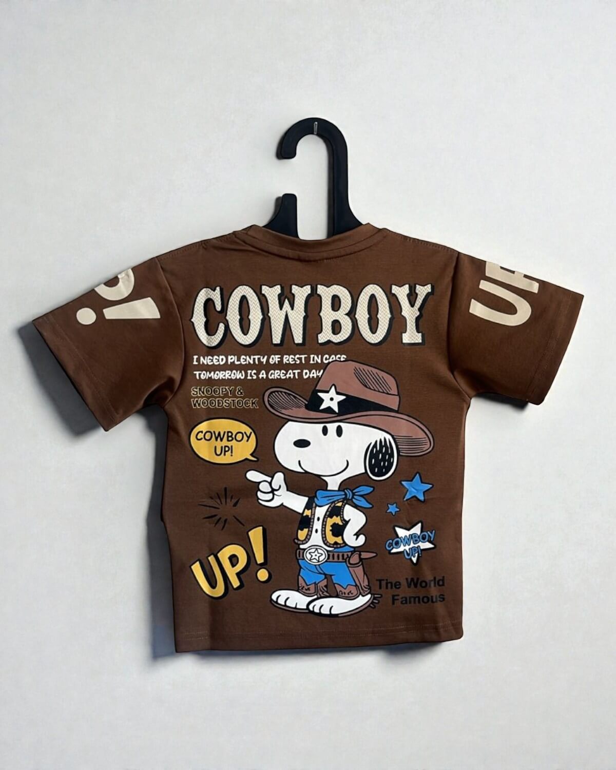 Experience premium comfort with this Cowboy Brown Snoopy Drop Shoulder TShirt. Made from a high-quality imported stretchable poly and cotton mix, it offers a flexible fit and a soft feel. This design stands out with a charming “Cowboy Up” front graphic and a bold, full-scale Cowboy Snoopy back print for a complete streetwear aesthetic.