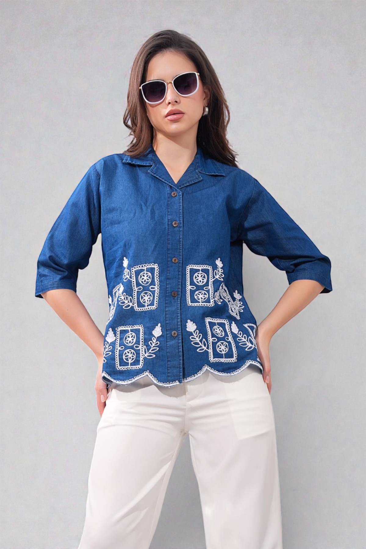 This premium two-piece set features a navy blue button-down shirt with white floral embroidery and a curved scalloped hem. Crafted from breathable Soft Denim, it is paired with tailored white trousers for a polished yet comfortable look.