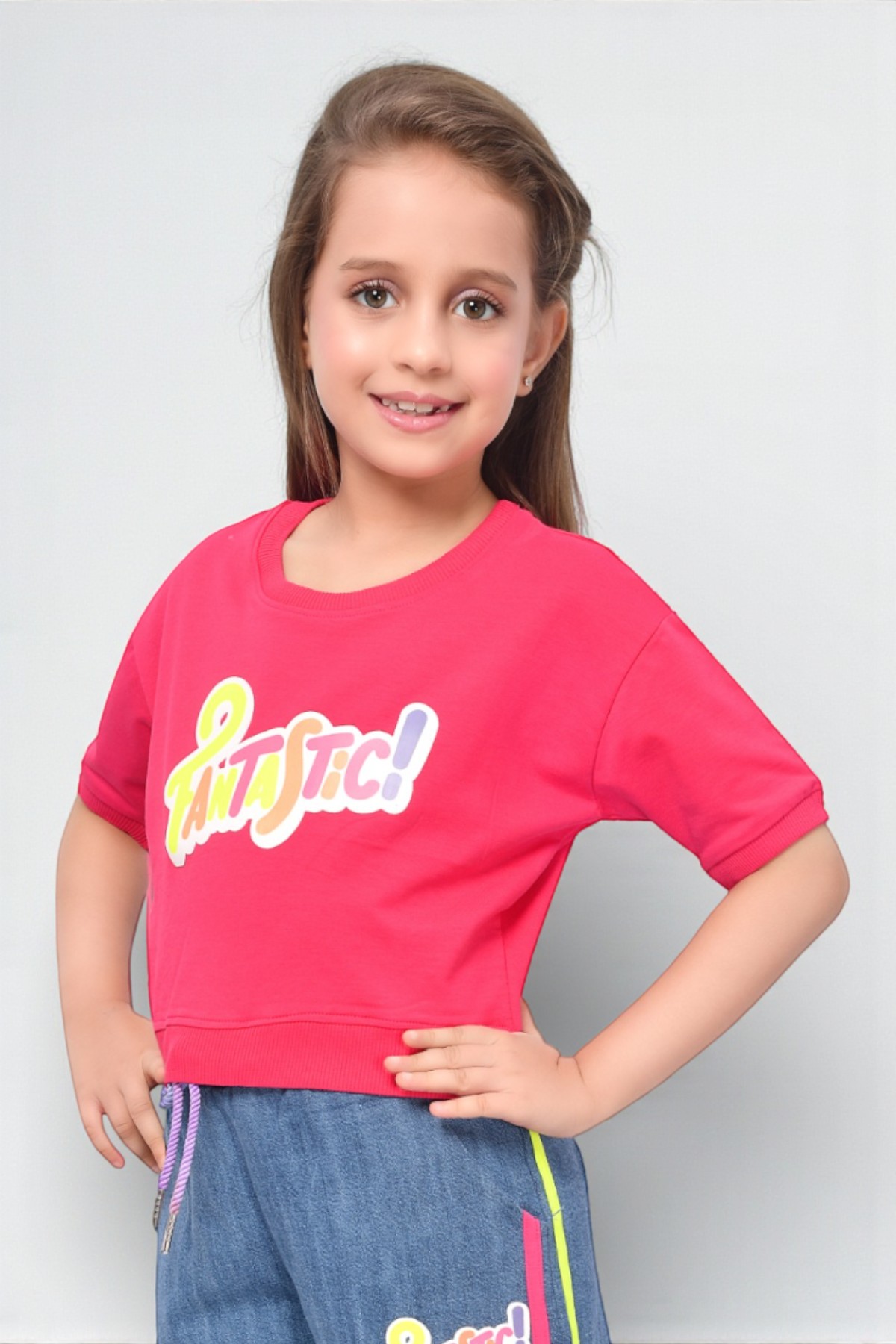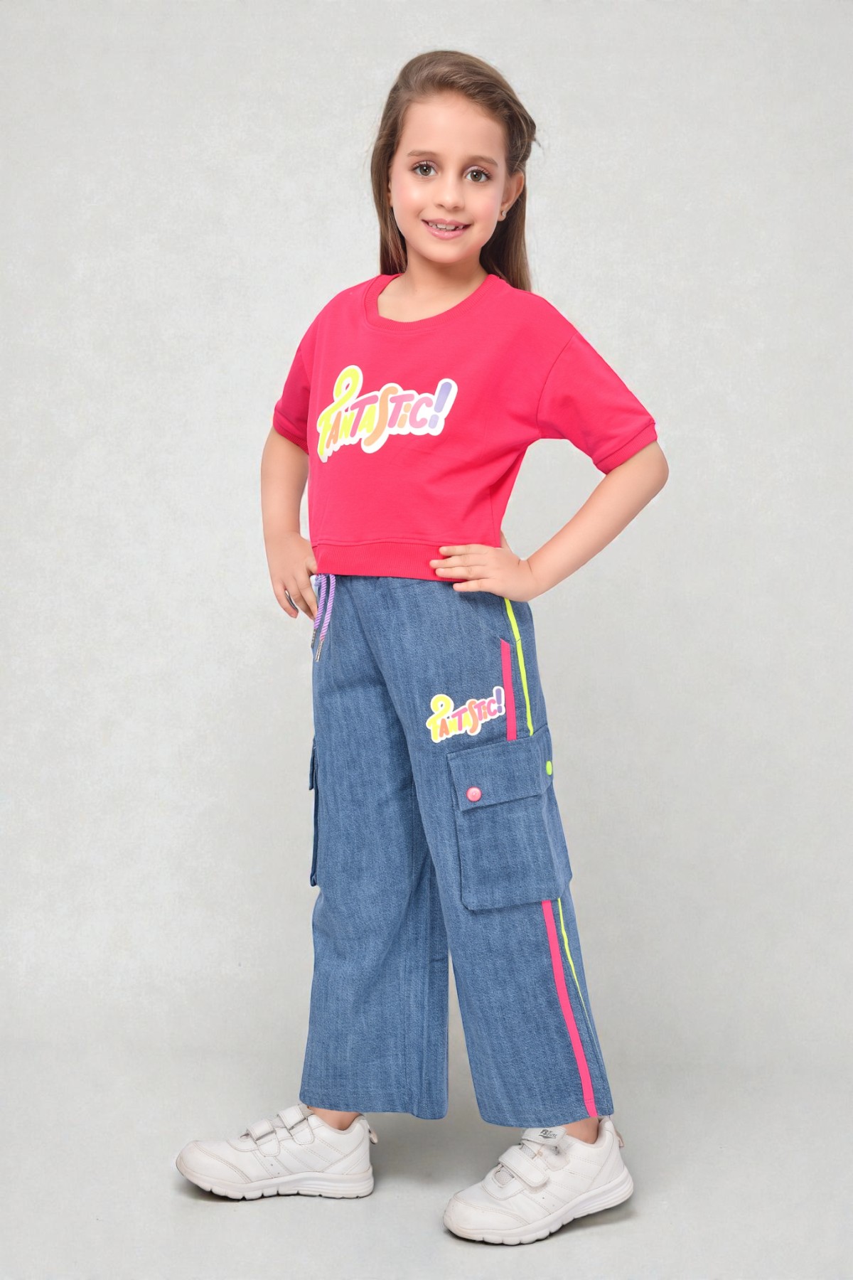 Elevate her everyday style with this trendy two piece outfit designed for comfort and play. This set features a vibrant rani crop top with a bold “Fantastic” graphic paired with matching wide leg denim cargo pants.
