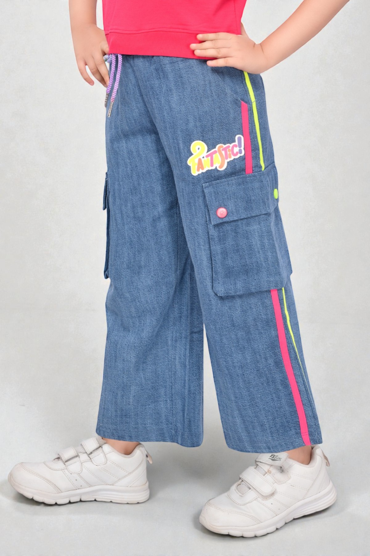 Bottoms: Mid wash denim cargo pants with side pockets neon piping and an elastic waistband.
