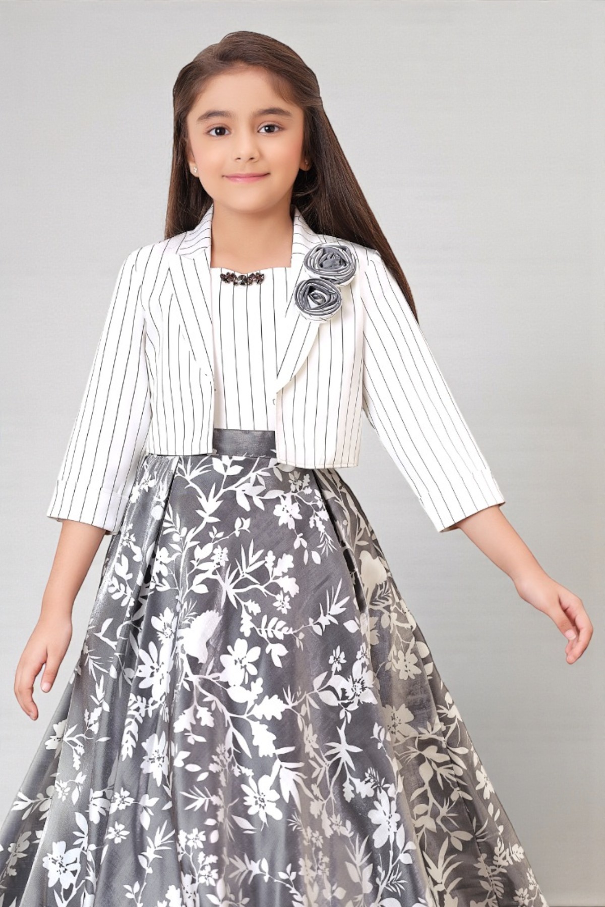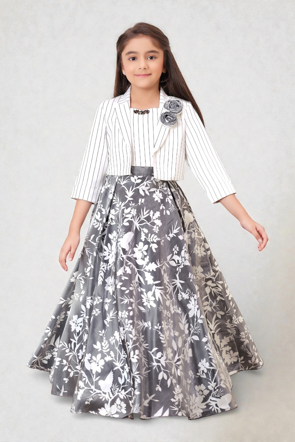 Girls Silver Charcoal Floral Gown and Striped Jacket Set