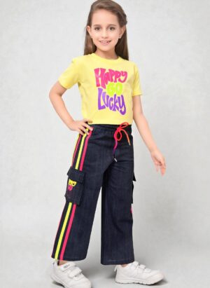 Give your little girl a trendy and comfortable look with this stylish casual wear set. The black t-shirt features a colorful “Super Cool” print, paired perfectly with blue track pants accented with sporty side stripes. Designed for all-day comfort, this outfit is ideal for playtime, outings, and everyday wear.
