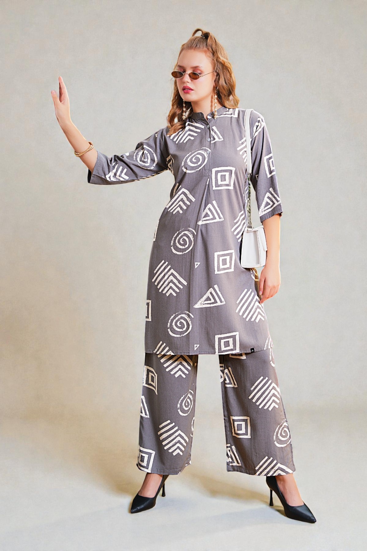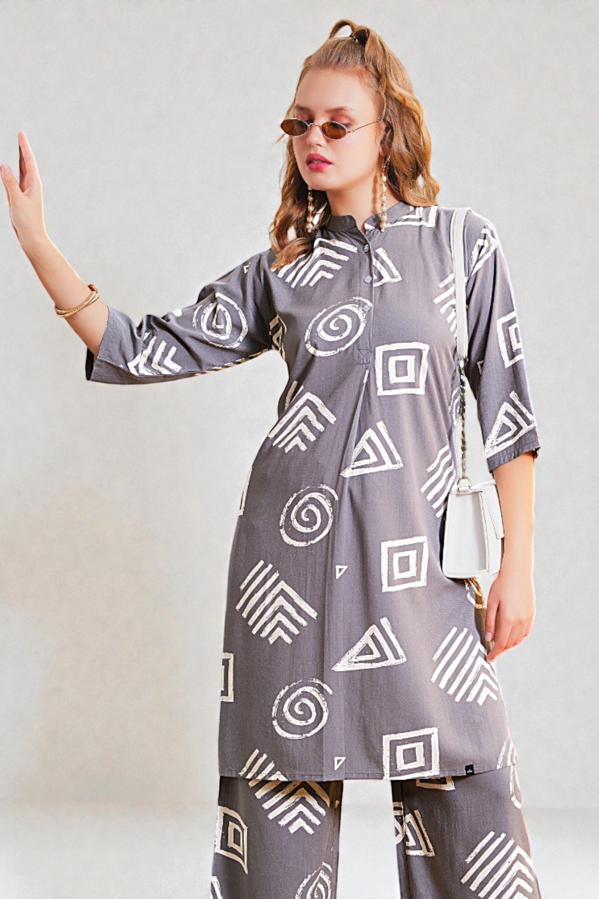 This sophisticated two piece ensemble offers a perfect blend of style and ease with a longline button down tunic and matching flowy wide leg trousers. Crafted from premium rayon fabric, the outfit features a crisp white geometric pattern over a neutral grey base for a polished and comfortable look.