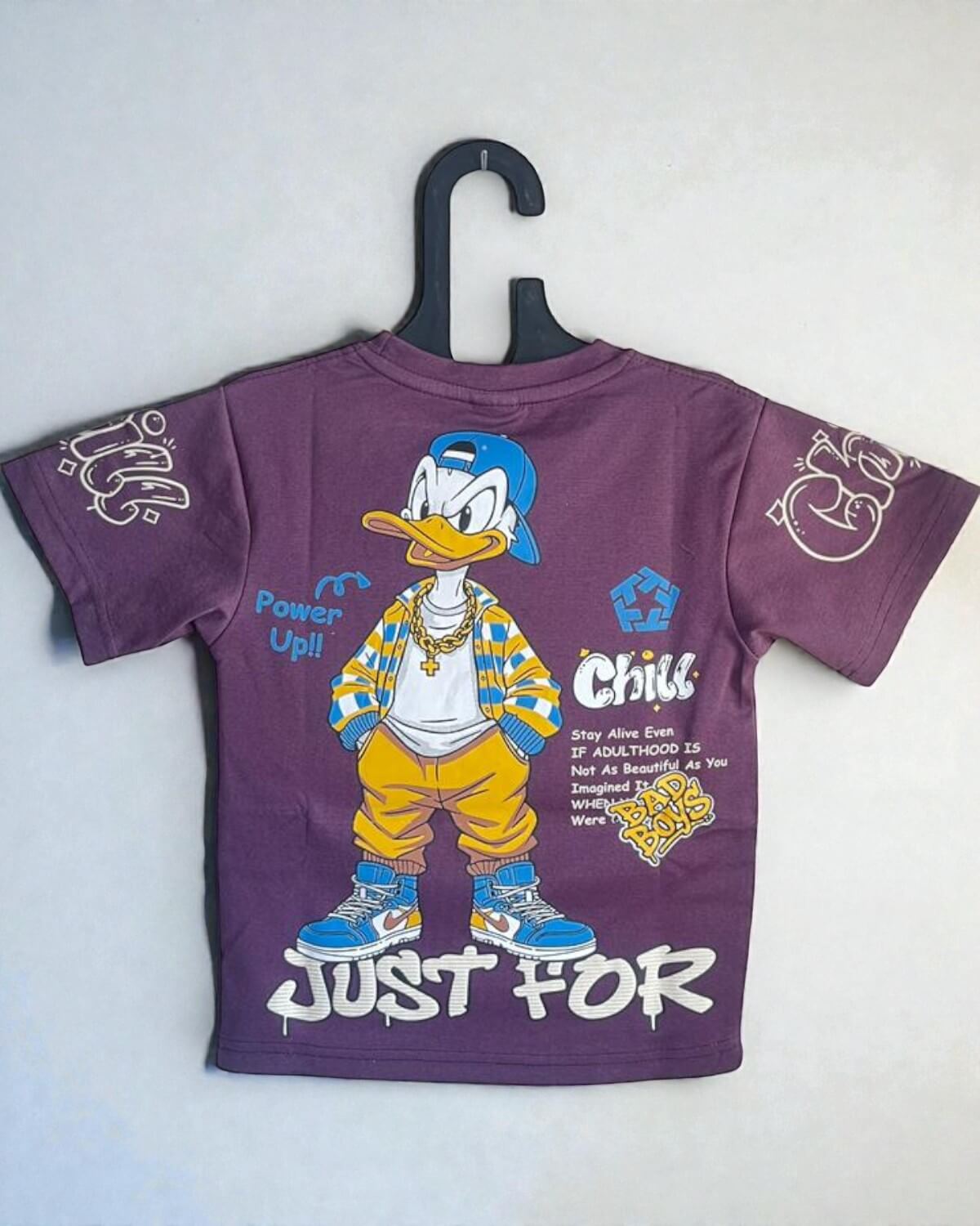 This Just For Fun Mauve Character TShirt is made from a premium imported stretchable poly and cotton mix for a soft, flexible fit. The design features a “Bad Boys” Donald Duck graphic on the front and a bold matching character print on the back. Finished with graffiti-style sleeve art, it offers a complete and modern streetwear aesthetic.