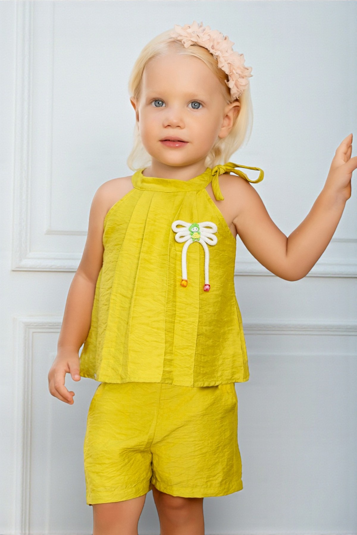 Add a pop of color to her summer wardrobe with this vibrant Lime Green Halter Top and Shorts Set. Made from a lightweight textured fabric, this set features a pleated halter neck with a charming bow accent and matching comfortable shorts. It is the perfect choice for sunny days and playful outings.