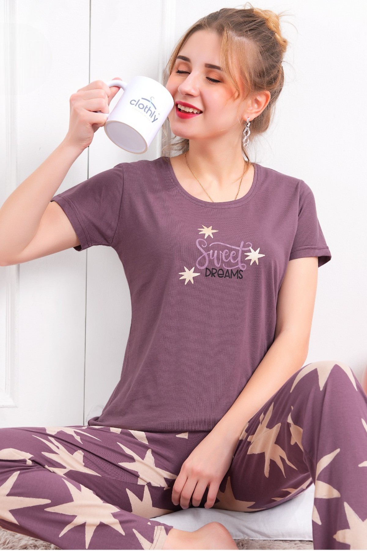 This charming two-piece set is perfect for winding down in style. The deep mauve color and playful star accents make it a standout choice for your sleepwear collection.