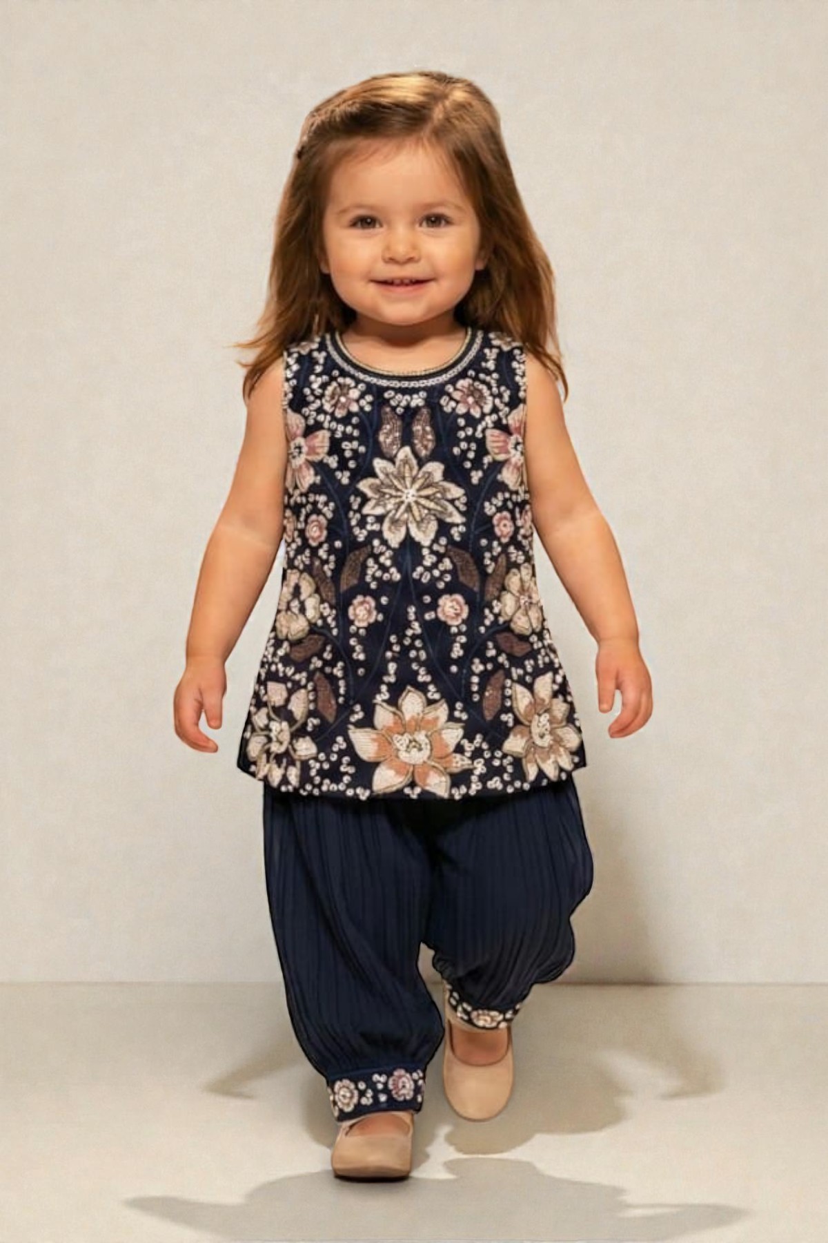 Add a touch of sophistication to your child’s ethnic wear with this stunning Navy Floral Embroidered Kurta Dhoti Set. This outfit features a sleeveless tunic adorned with intricate floral threadwork and a unique pleated bottom for a blend of traditional style and modern flair. It is ideal for evening celebrations and festive gatherings.