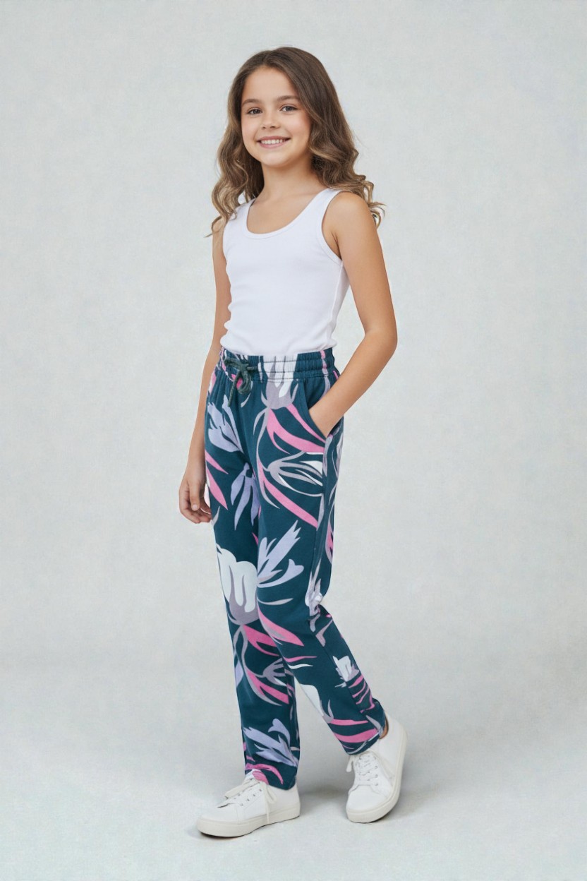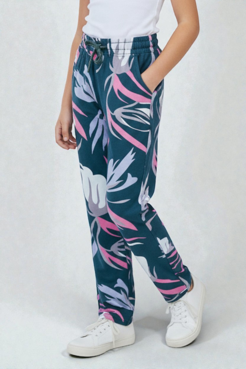Product Description Add a splash of color to her wardrobe with these Teal Printed Pyjama bottoms. Featuring a deep teal base with vibrant pink and lavender leaf patterns these are perfect for both play and rest.