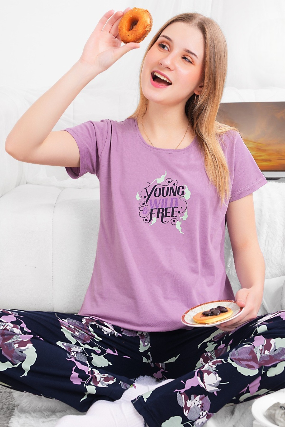 Stay cozy and stylish with this vibrant two piece loungewear set. The outfit features a soft purple short sleeve graphic tee paired with comfortable floral print pajama pants. It is perfect for relaxing at home or enjoying a peaceful night of sleep.